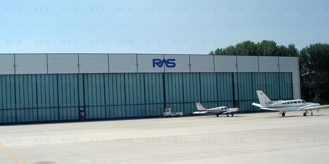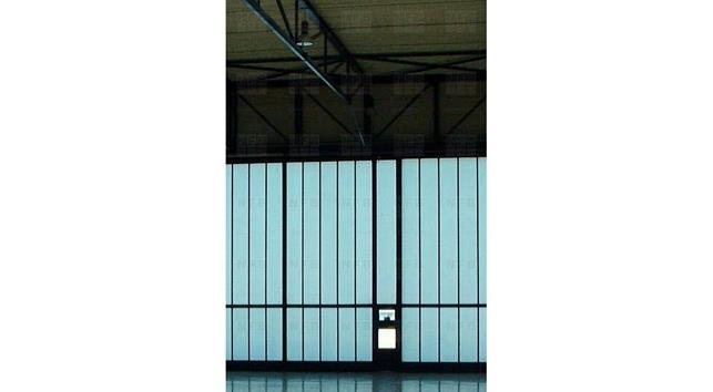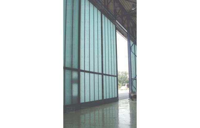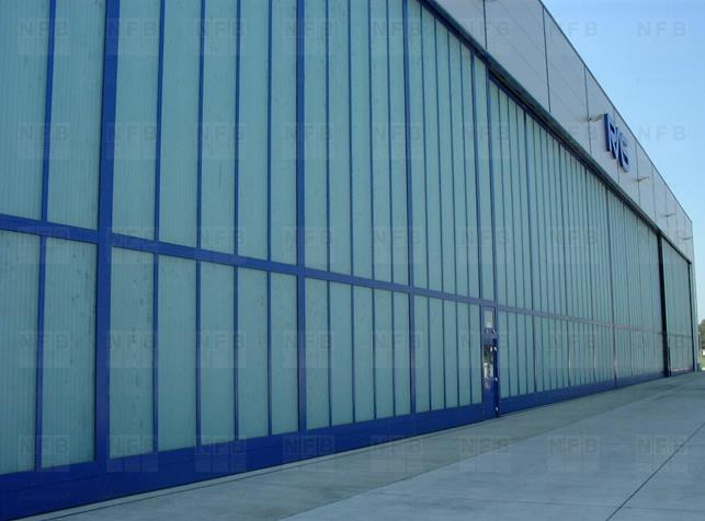 Hangartor als Teleskopschiebetor mit lichtdurchlässigen GFK-Platten beplankt.