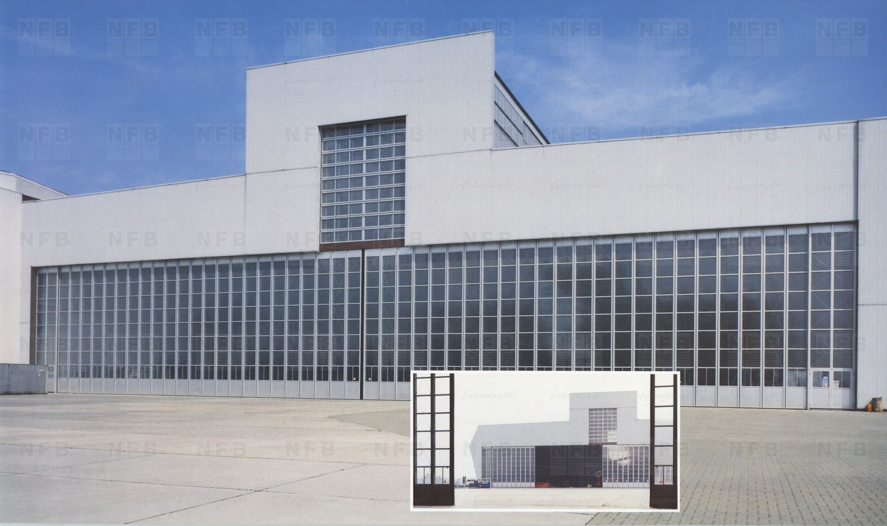 Das Hangartor bewegt sich zur linken und zur rechten Seite und legt sich in einem 90 Grad-Winkel parallel an die Hallenwand an. Das Hutzentor bietet den Einlass für das Leitwerk eines Airbusses und dient ausserdem als Führungsschiene für den mittleren Teil des oben zunächst ungeführten Gesamtflächentores.